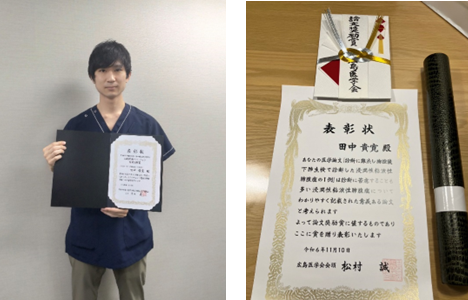 当院で初期臨床研修を修了した田中貴寛医師が、第77回広島医学会総会で「令和6年度論文奨励賞」を受賞しました。