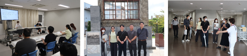 院内で原爆医療についての研修を受けた後、当院のメモリアルパークで、爆風でゆがんだ鉄製の窓枠や窓ガラスの破片が突き刺さった痕が残る壁、慰霊碑等をご覧いただき原爆の惨状を学んでいただきました。