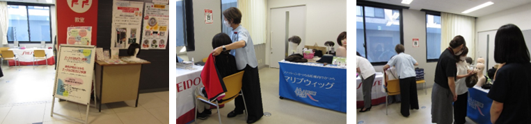 第1回目は「パーソナルカラー診断・似合う口紅・ウィッグ相談」と題し、資生堂とマリブウィッグのご協力をいただいて開催しました。当日は患者さんやご家族の方々だけでなく、スタッフの皆さまにもブースに立ち寄っていただき、計24名のご参加をいただきました。会場はとても和やかで、笑顔あふれる時間となりました。