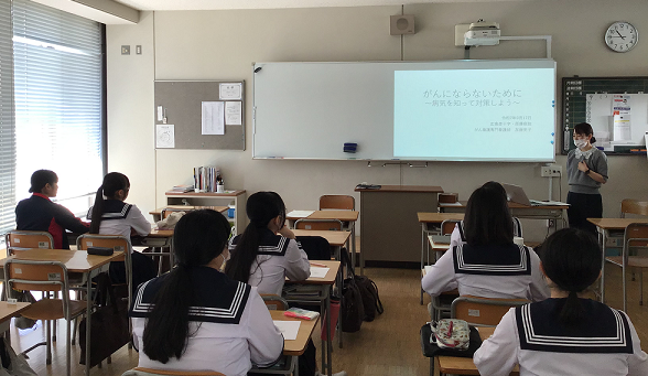 当院のがん看護専門看護師が講師を務め、「がんにならないために」をテーマに保健授業の一環としてお話ししました。現在の日本では、2人に1人ががんにかかると言われています。予防に努めていても、誰もが罹患する可能性がある今、がんという病気について正しく知り、正確な情報を持つことが大切です。