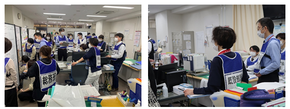 災害対策本部では、緊急地震速報の放送後、災害対策本部を立ち上げ、院内の被害状況等の情報収集を行いました。そして、フェーズにあわせて次々に付与される状況や関係部署からの報告に対し、職員は災害対応マニュアルに従って活動しました。