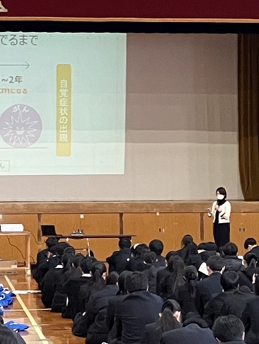 講座では、がんがどのように発生するのかといった基礎的な仕組みから、国内におけるがん患者数の現状、もし自分や家族ががんになった場合にどのように行動すればいいか、そして日常生活の中で意識できる予防のポイントまで、幅広い内容を取り上げました。生徒の皆さんが理解しやすいよう、実際の事例や身近な生活習慣を例に挙げながら、丁寧に解説しました。