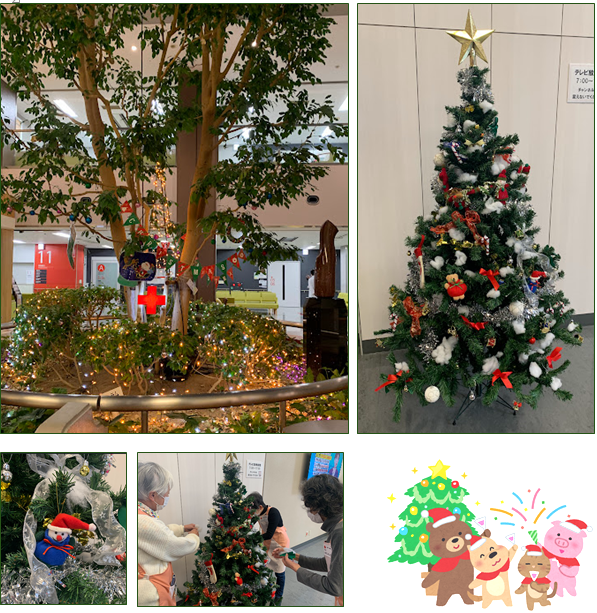 テレビ横へは、病院内のボランティアとして活躍いただいている「すみれ会」の方たちにお手伝いいただき、クリスマスツリーを飾りました。