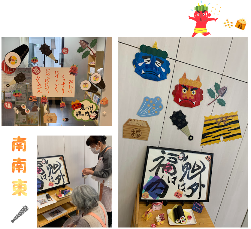 節分は、季節の変わり目に悪いものを追い出し、縁起のよいものを食べて新しい季節を迎える行事です。節分を前に、病院内のボランティアとして活躍いただいている「すみれ会」の方々にお手伝いいただき、ロビーと患者図書室の飾りつけを行いました。