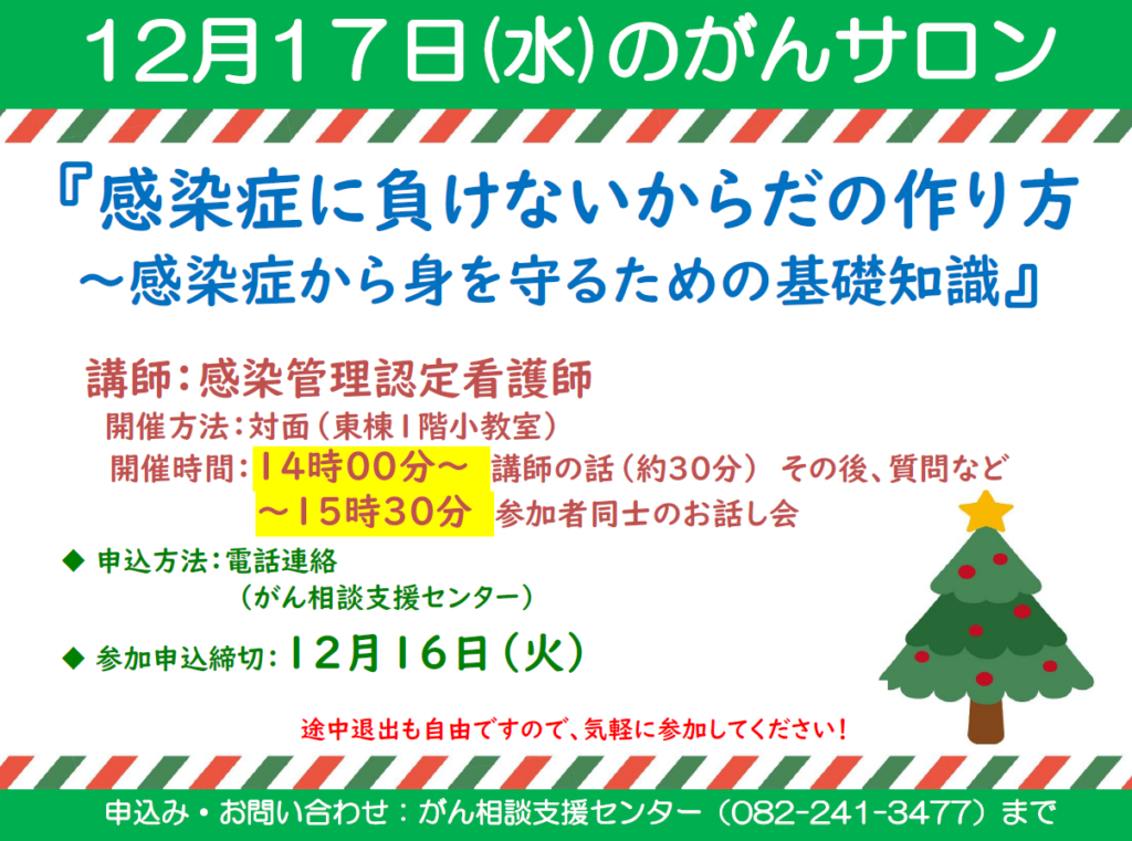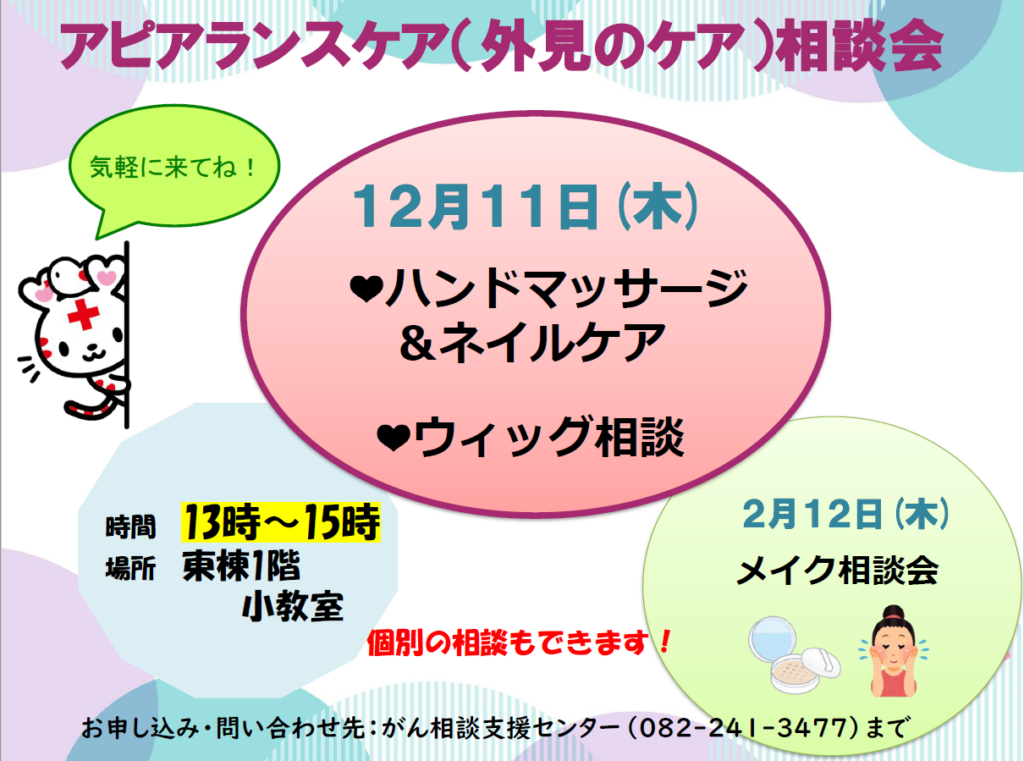 - がん相談支援センターへご連絡ください。 連絡先:(082-241-3477)